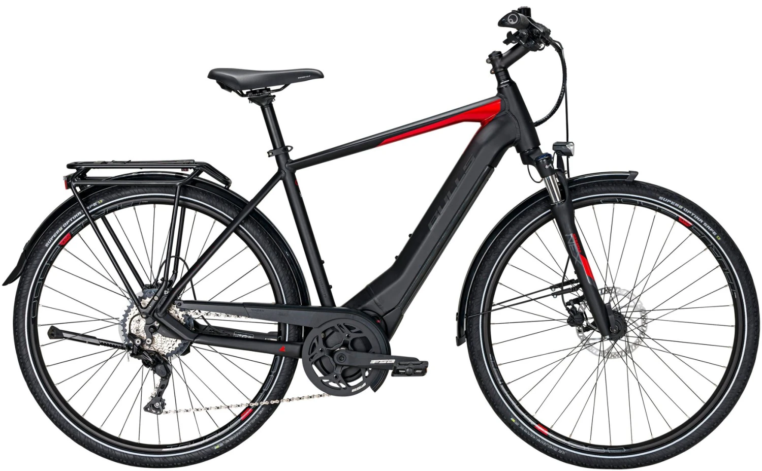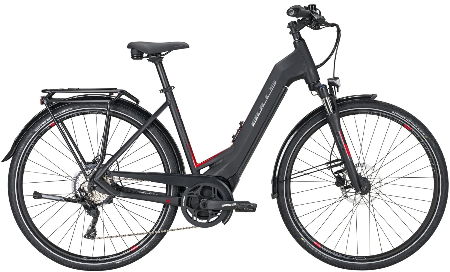Hydroforming Alu-Rahmen mit Tapered Steurrohr, NEX-E25-LO Federgabel, Deore Schaltwerk, Schalthebel und Zahnkranz (11-42 Zähne), Tektro M275 Disc-Bremsen (160/180mm), Ryde Taurus 2000 Disc Felgen, Brose Drive-T Mag Mittelmotor 250W / bis 70Nm, 555Wh oder 750Wh Akku (Aufpreis), Beleuchtung über den Akku, 50 Lux Lampe, großes TFT-Display, Supero Optima Safe Reifen 47-622, Formula Naben, Ergon Griffe