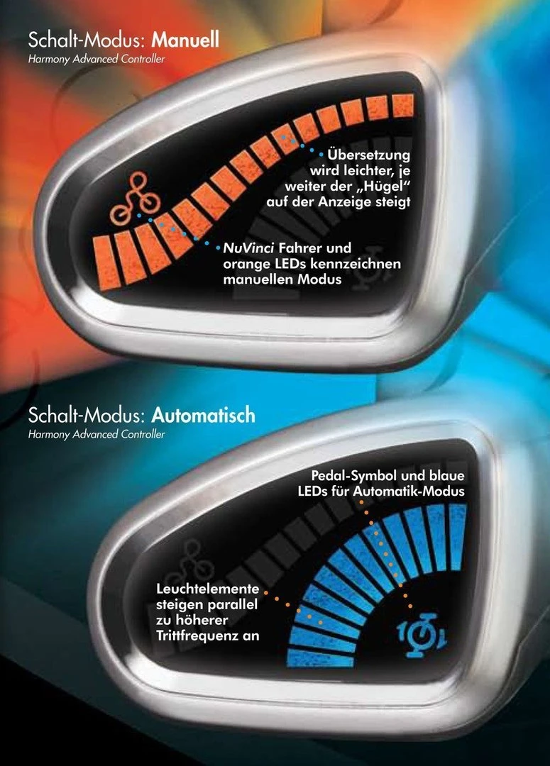 - Automatischer Modus: Sie wählen eine bevorzugte Trittfrequenz und das NuVinci Harmony-System wickelt alle Schaltfunktionen mühelos und weich ab, auch unter schnellen „Stop-and-Go“-Bedingungen.