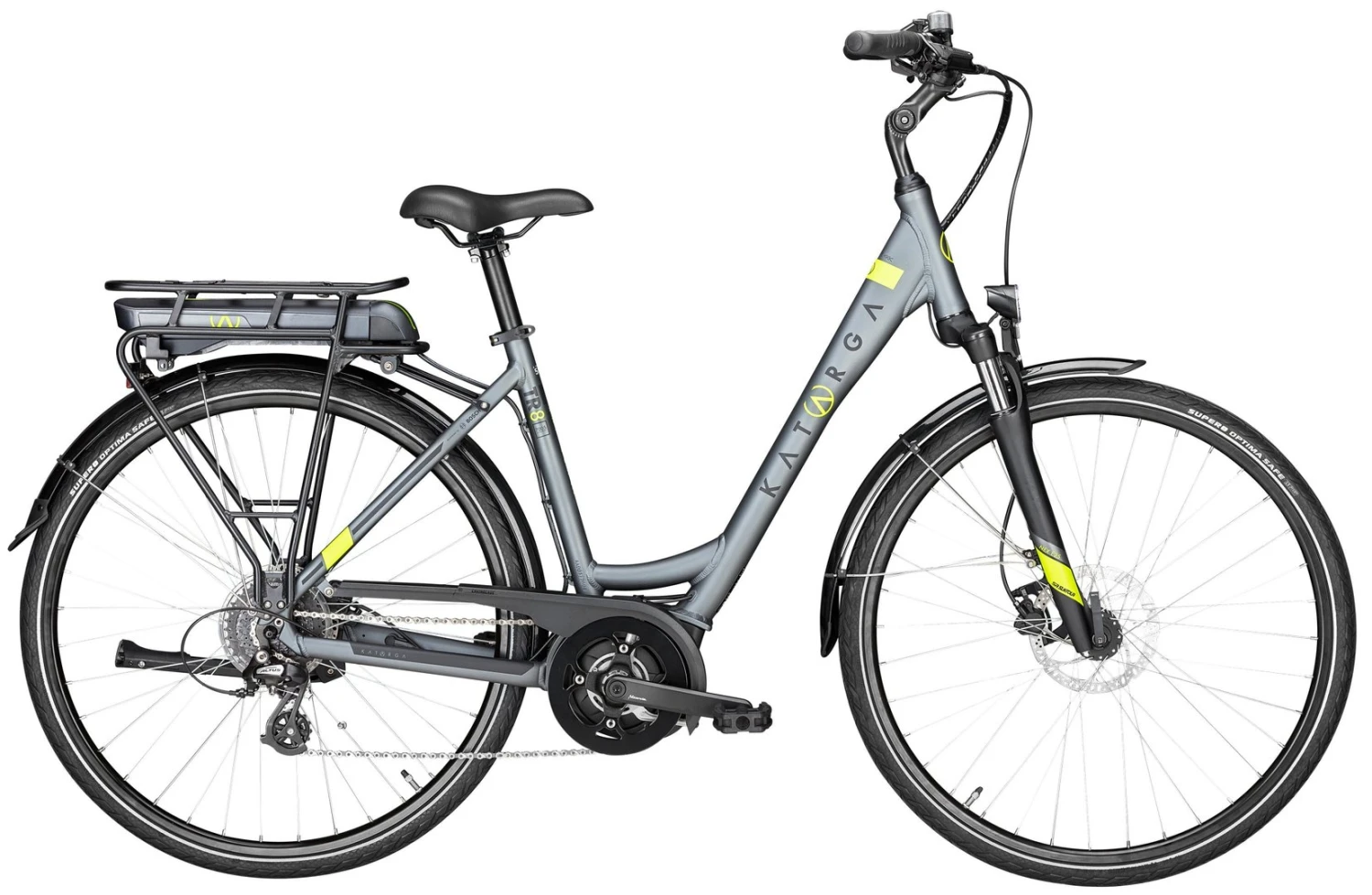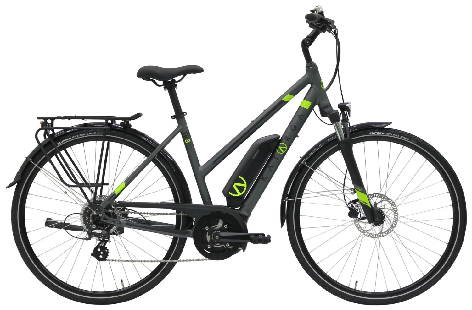 7005 Alu-Rahmen mit innenverlegten Kabeln, NEX-E25-DS Federgabel, Altus 8-Gang Schaltwerk und Schalthebel, Tektro HD-M285 Disc-Bremsen (160/180mm), DDM-1 Hohlkammerfelgen, verstellbarer Lenkervorbau, Bosch Active Line Plus Mittelmotor mit 300Wh, 400Wh (Aufpreis) oder 500Wh (Aufpreis) Akku, Supero Optima Safe Reifen 40-622, 15 Lux LED-Lampe, I-Rack Gepäckträger