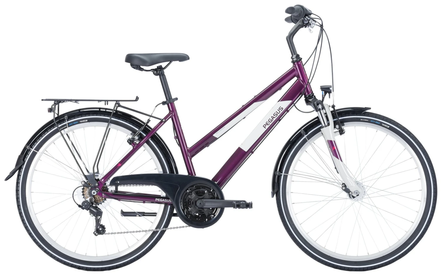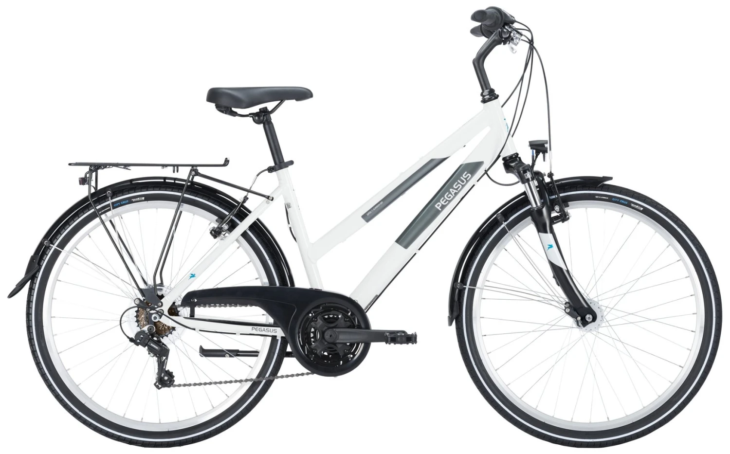 6061 Alurahmen mit Suntour CR-8V-P Federgabel, Shimano Tourney Kettenschaltung mit Revoshift Schalthebeln (Drehgriffe), STYX Alu Kurbeln, Alu V-Bremsen vorne und hinten, Alu-Hohlkammerfelgen, Vee Tire City Cruz Reifen (47-559), Downhill-Lenker, Kettenschutz, komplette Straßenausstattung mit Shimano Nabendynamo, Standrücklicht und 30-Lux LED-Lampe