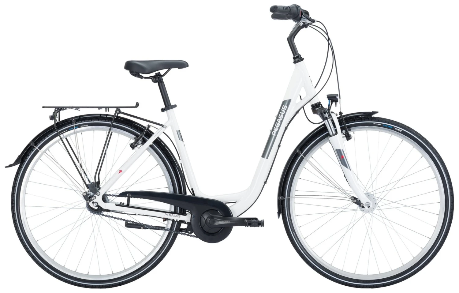 Alu Rahmen, Suntour CR-8V-P Federgabel, Shimano Nexus Nabenschaltung mit Rücktritt und Drehgriff, Alu V-Bremsen vorne und hinten, Suntour Alu Kurbeln, Alu Hohlkammer-Felgen, Aluminium Vorbau, Nabendynamo, 30 Lux LED-Lampe, Standrücklicht, Stahl Gepäckträger, einstellbarer Seitenständer