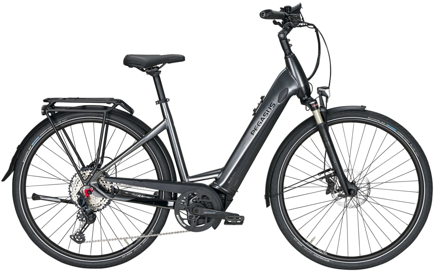 Schöne Formen und viel Fahrkomfort, so macht das Premio Evo 12 Lite auf sich aufmerksam. Der in drei Varianten verfügbare Rahmen ist dank innenliegendem Akku besonders glattflächig; eng ans hintere Schutzblech geschmiegt ist der solide Gepäckträger mit seinen schräg abfallenden Seitenteilen. Der sportliche, drehmomentstarke Bosch-Motor wird von einem integrierten Akku gespeist, der je nach Nutzungszweck in drei unterschiedlichen Größen erhältlich ist; eine gut erreichbare Ladebuchse am Unterrohr vereinfacht die Handhabung. Neben der aufrechten Sitzhaltung sorgen Luftfedergabel und Federsattelstütze für Komfort; rutschfeste Pedale, eine superhelle Lichtanlage und Scheibenbremsen stehen für hohe Sicherheit. Die breit abgestufte 12-Gang-Kettenschaltung kommt gerade sportlichen Nutzern sehr entgegen.